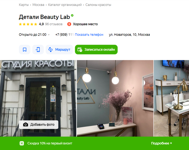 Так выглядит профиль студии «Детали Beauty Lab» у метро «Новаторская» в Яндекс Картах. Анастасия подключила Рекламную подписку и заполнила в нём раздел «Акции» — после этого в профиле сразу появилось спецпредложение для новых клиентов