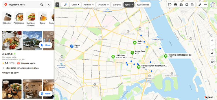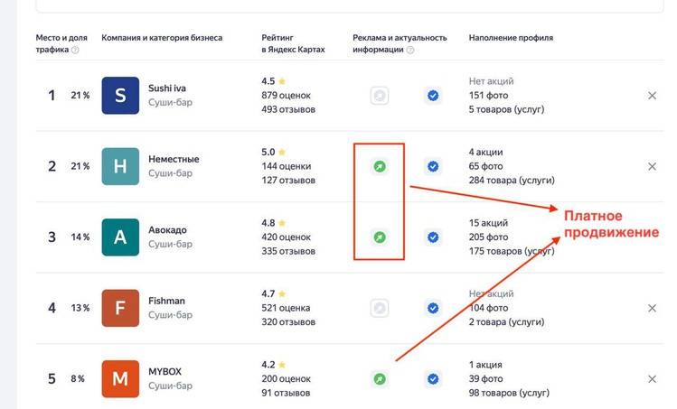 В Яндекс.Картах сначала показываются все компании, которые купили приоритетное размещение, а места в выдаче между ними распределяются в зависимости от удаленности от пользователя.