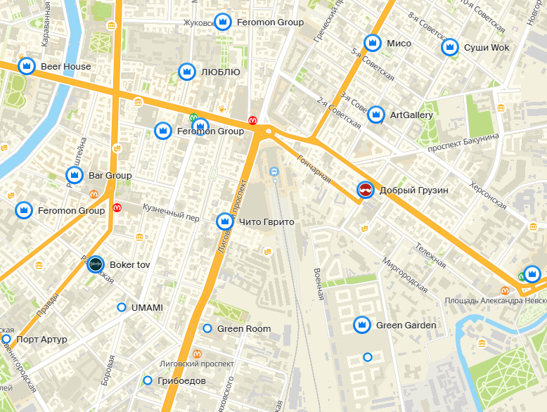 2ГИС точно так же выделяет компании, оформившие продвижение: показывает выше в результатах поиска, на карте добавляет более заметную метку, которая, однако, отличается не цветом, а размером и пином-короной. Логотип в карточку компании можно загрузить за дополнительную плату.