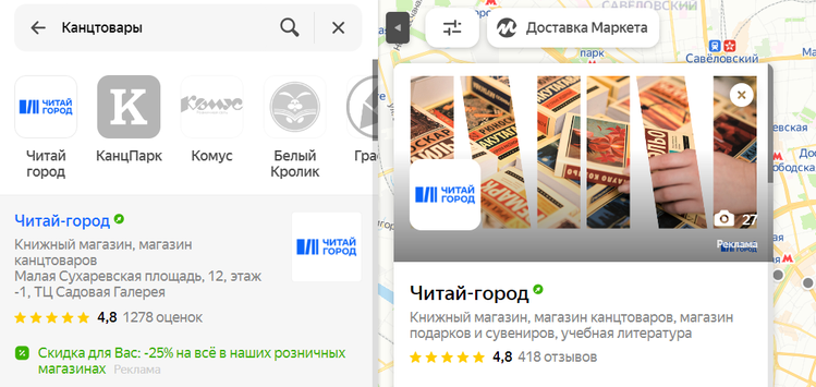 Принцип инструмента простой и похож на рекламу в поисковиках. Когда пользователь набирает в поиске карт запрос, организация рекламодателя показывается выше и заметнее других компаний — конечно, если запрос соответствует тематике бизнеса.