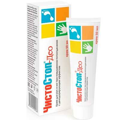 Для ухода за кожей стоп с повышенным потоотделением создано специальное косметическое средство — Чистостоп Део. Его особенность в использовании в качестве активных компонентов ряда натуральных составляющих.