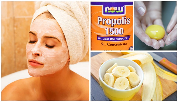 Половину спелого банана размять до состояния пюре и смешать со свежим желтком куриного яйца. В массу вести чайную ложечку масляного экстракта прополиса. Накладывать на лицо плотным слоем, смывать через сорок минут.
