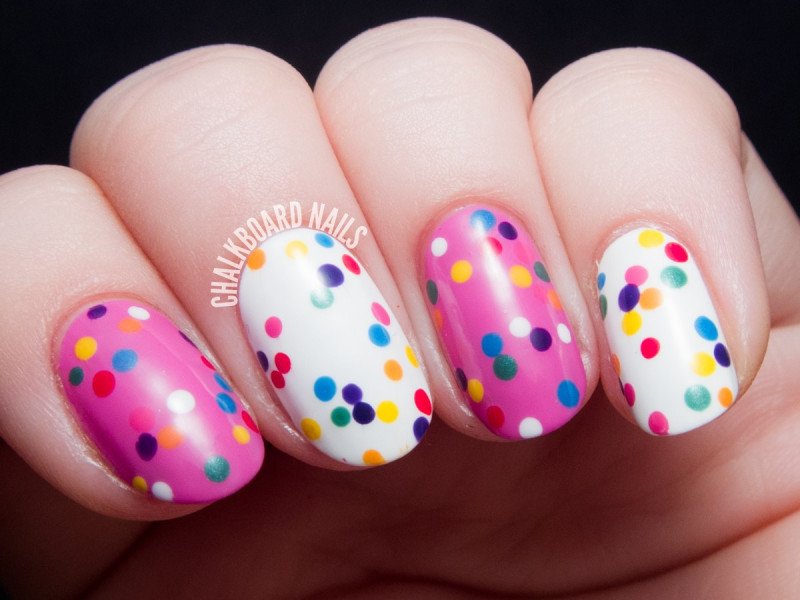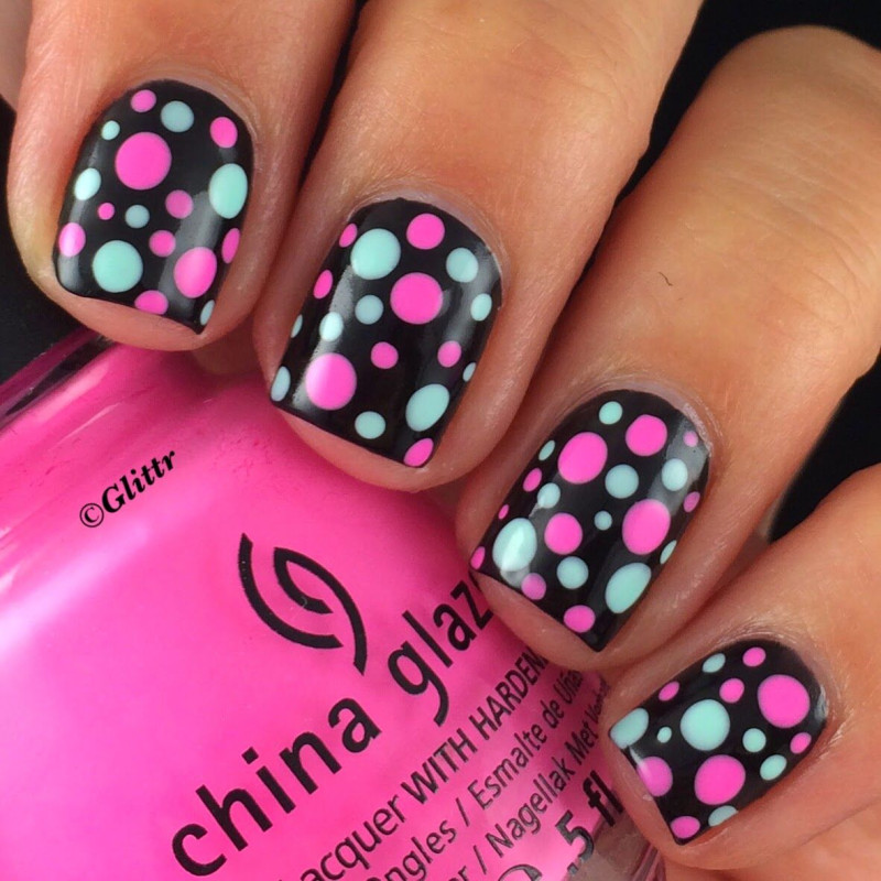 А самый простой геометрический маникюр делается так: берется два контрастных покрытия, например, черное и белое. Одним из выбранных лаков покрываются ноготки, а сверху вторым цветом ставятся точки, чем они будут мельче, тем эффектнее будет смотреться. Такой маникюр делается легко и быстро, а выглядит очень оригинально.