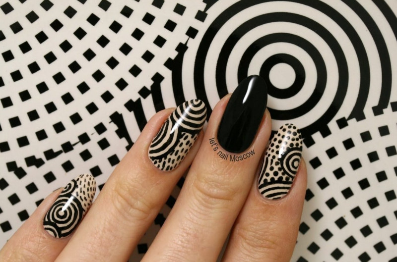 С помощью кисти или стемпинга можно создать красивые черно-белые рисунки на ногтях, будь то интересные орнаменты или лунный маникюр с клеткой, черные брызги или газетный маникюр с френчем в виде капель.