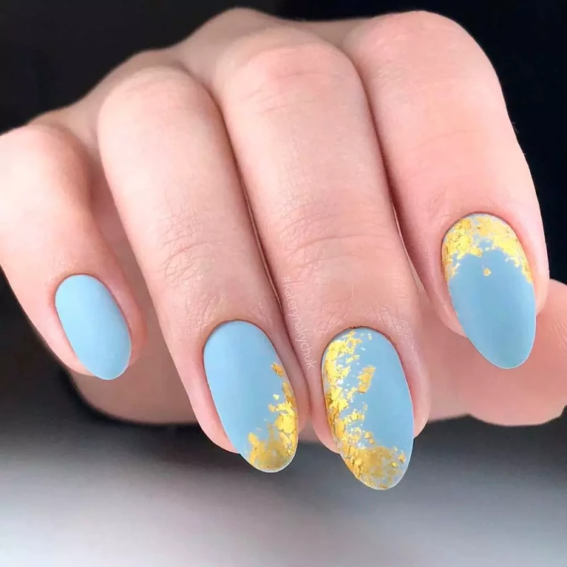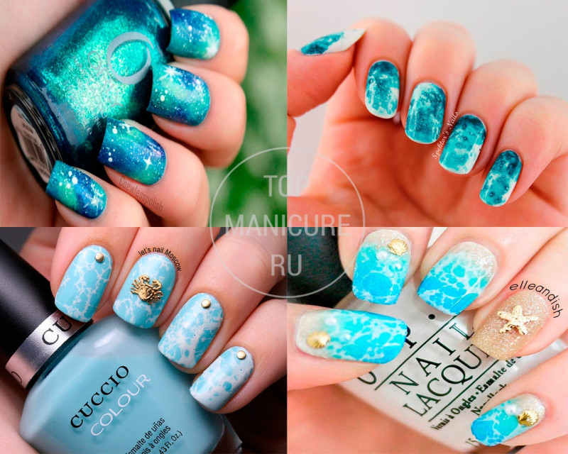 Голубой подходит для создания небесного и мраморного дизайна. Вязанный молочно-синий маникюр добавит образу нежности и уюта.