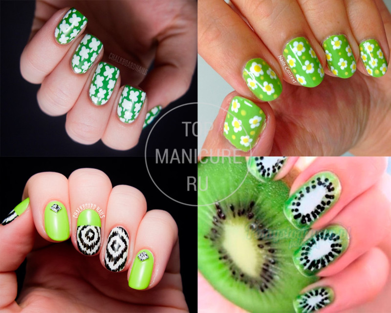Маникюр с зеленым и белым лаком представлен нарисованными цветочками, этническими узорами и рисунком киви. Этнический орнамент рисуется тонкой кистью очень мелкими штрихами. Чтобы нарисовать киви, нанесите на зеленые ногти белое овальное пятно, а вокруг него расходящиеся во все стороны линии. Останется только нарисовать черные точки.