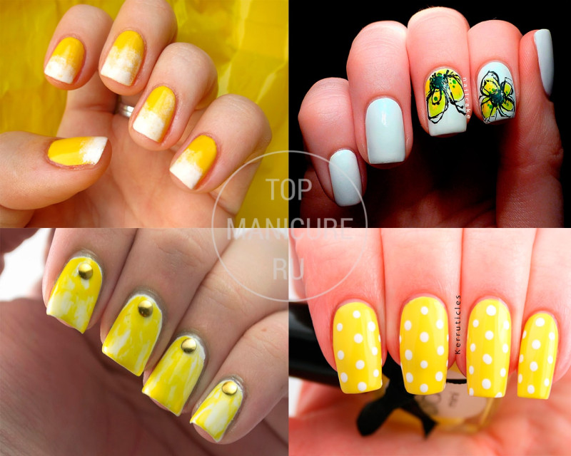 Маникюр с желтым и белым лаком можно украсить градиентом, цветочным рисунком или горошком. Смотрится это очень ярко!