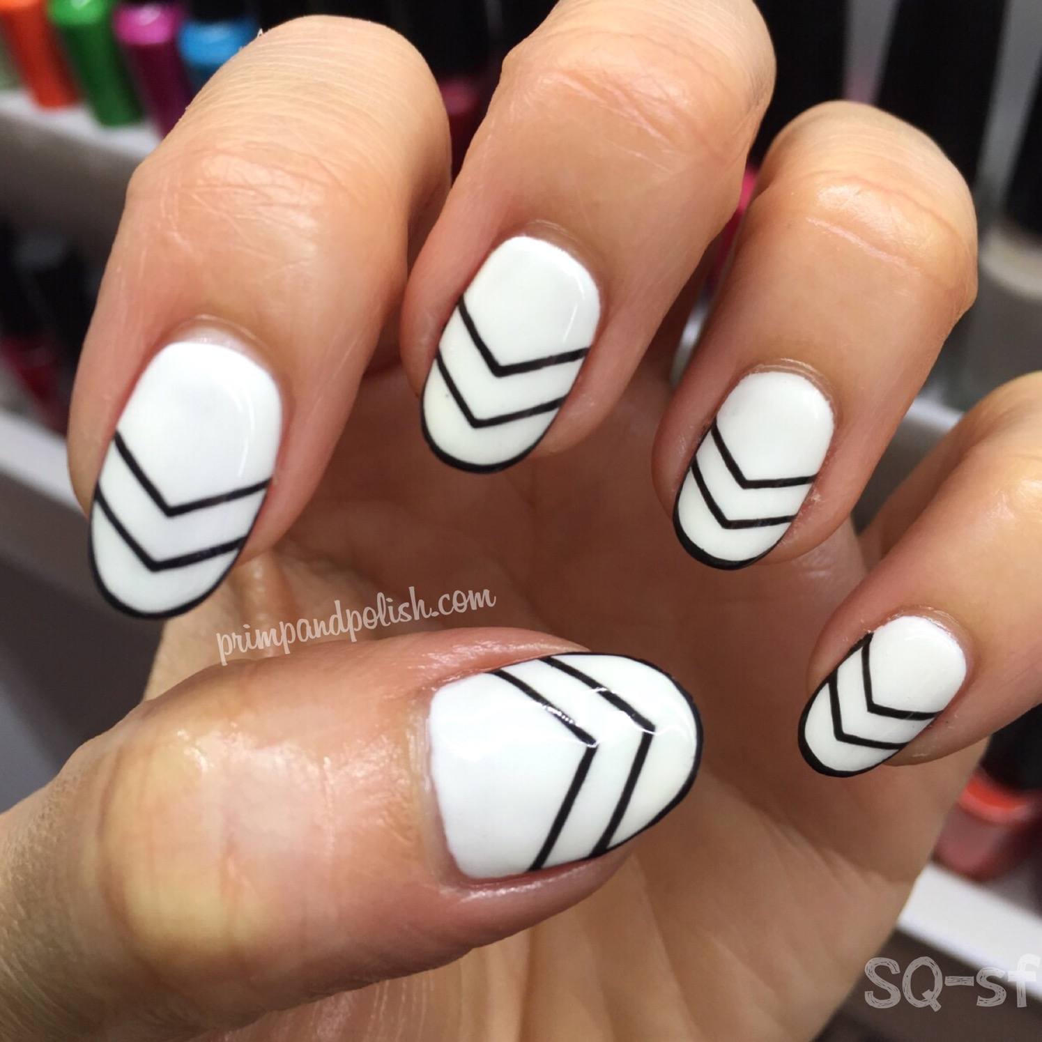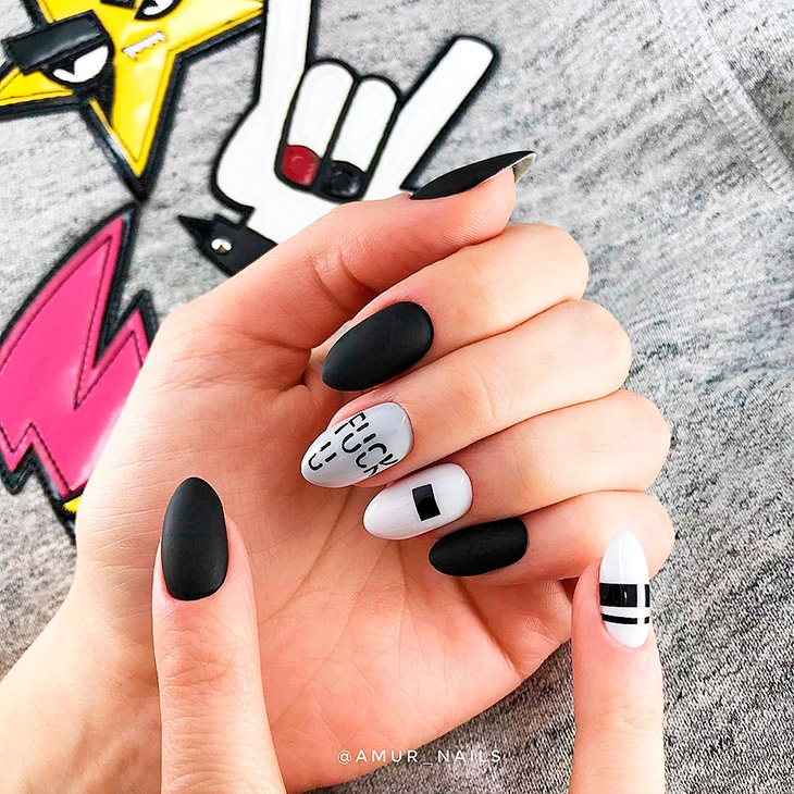 Такой белый маникюр с черным контуром делается с помощью фломастера для ногтей или тонкой кисти. Получается очень яркий и контрастный дизайн.