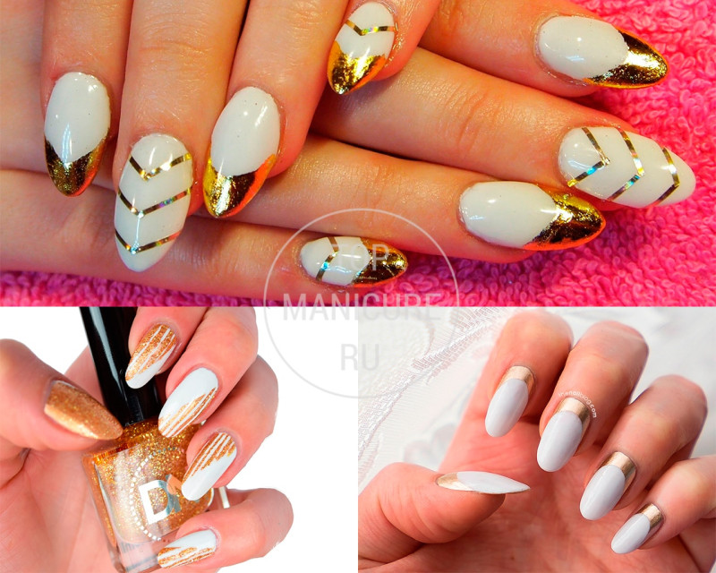 Можно украсить белые ногти золотыми лентами для дизайна, нарисованными полосками и обратной лункой.
