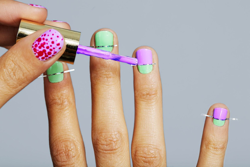 После этого наклеить на ноготки полоски в форме ромбов, квадратов или других узоров. Покрыть ноготь другим оттенком лака и высушить его в УФ-лампе, если это гель-лак, или дождаться высыхания на воздухе, в случае использования декоративного лака.