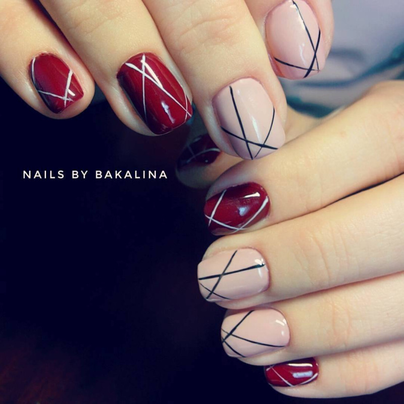 Оригинально выглядят перекрещивающиеся, а также диагональные линии. Главноене переборщить с рисунком. Оптимальный вариант наносить на ногти 2-3 полоски, в противном случае маникюр будет перегружен рисунками и станет просто нелепым.
