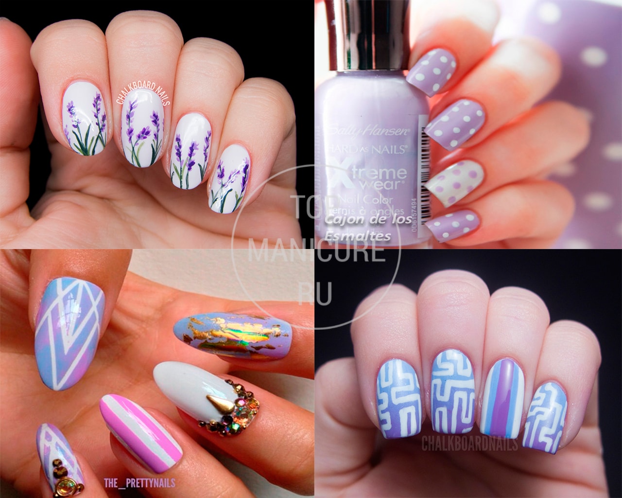 Белый маникюр с сиреневым лаком смотрится очень нежно и может быть очень разным. Это могут быть нарисованные сиреневые цветы, горошек, полоски, украшения из страз и фольги и причудливые геометрические формы, нарисованные кистью.
