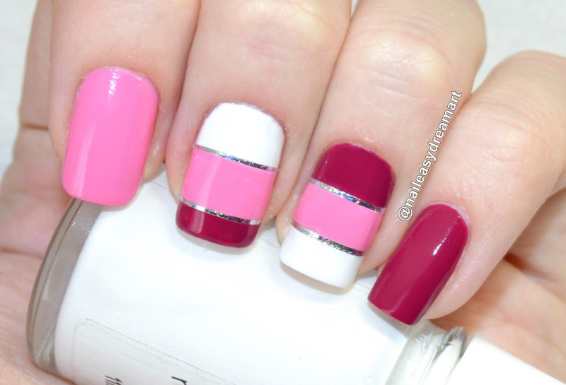 Прикладывая кусочки скотча к ногтю, вы можете отделить пространство где будет находиться очередной слой лака. Используйте несколько контрастных оттенков лака, так ваш дизайн получится более объемным. Взгляните на пример создания геометрического маникюра с помощью скотча, представленный ниже, и вы поймете насколько это простое приспособление облегчает девушкам рисование красивых узоров.