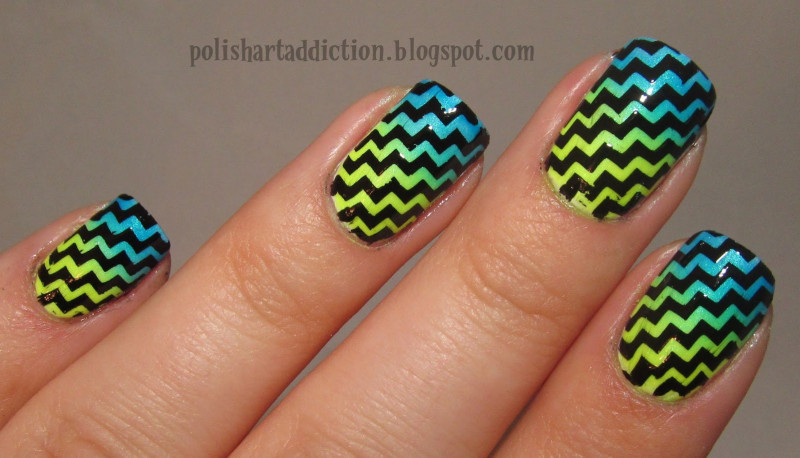 Дизайн на длинных ногтях может быть выполнен с использованием градиента: все ногтевые пластины всех пальцев, кроме безымянного, окрашиваются в голубой и розовый цвета, оставшийся ноготь красится белым, в качестве дизайна рисуется широкая горизонтальная полоска, начинающаяся у основания и заканчивающаяся свободным краем, на которою с помощью спонжа наносится градиент – переход от одного цвета к другому.