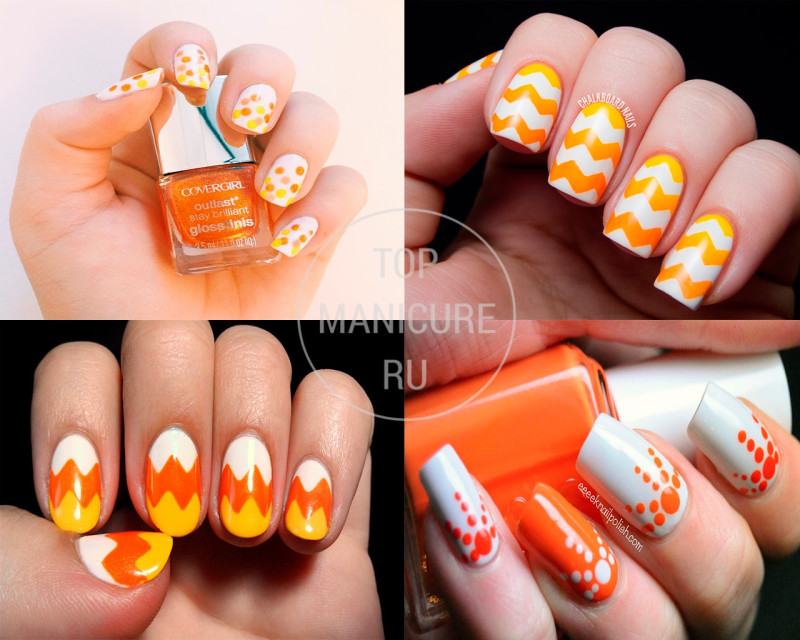 Здесь мы видим маникюр с белым и оранжевым лаком. Горошек делается дотсом, а зигзаги с помощью трафарета. Можно вырезать его ножницами из скотча. На белые ногти наклеиваются зигзагообразные трафареты, оставляя промежутки, и наносится оранжевый лак. Затем скотч нужно убрать.