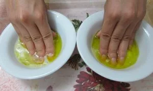 Ногти опустить в теплую ванночку и держать 10 – 15 мин. После процедуры руки нужно вымыть и нанести увлажняющий крем. Для достижения эффекта повторять процедуру нужно через день.