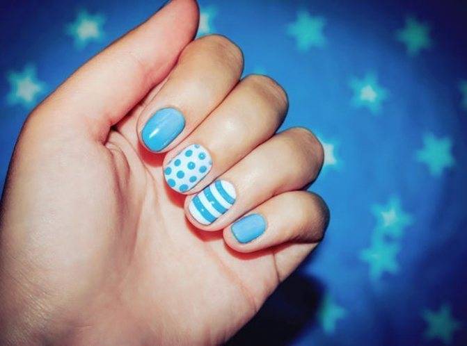 - Нужно для начала выбрать два лака, например белый и синий. Ноготь покрыть полностью синим оттенком.