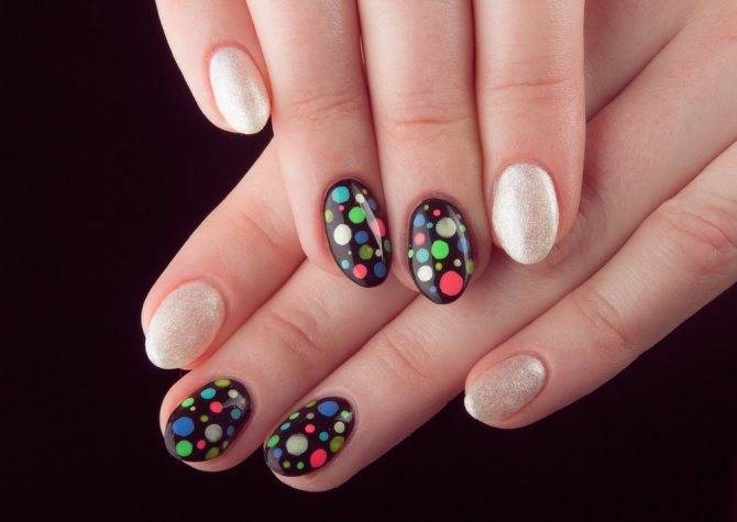 Вариант точечной росписи – роспись каплями. В центр ногтя ставится капля покрупнее, а вокруг располагаются капельки поменьше.