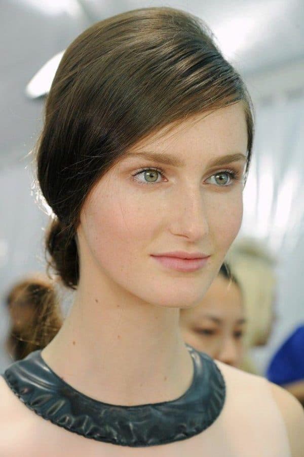Еще один признак стиля ретро – пучок, опускающийся ниже уровня затылка. Он выглядит объёмно за счёт начёсанных на макушке волос. Если чёлка длинная, её укладывают набок лёгкой волной. Если же она короткая, то просто прикрывает лоб.