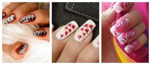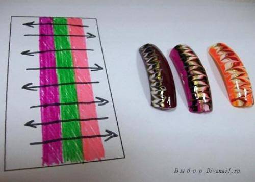 Теперь, будьте быстрой, прежде чем верхний слой высохнет. Сделайте несколько капель на ноготь лаком нужных цветов, и перемещайте иглу на поверхности в форме «8», в виде горизонтальных или вертикальных линий. Схемы рисунков по созданию рисунков с помощью иголки на ногтях приложены к уроку.