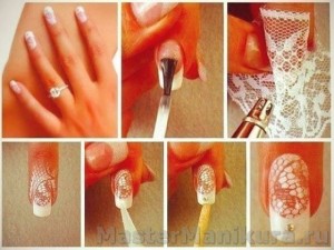- Приложить к ногтю кружево и постараться зафиксировать его (можно скотчем к пальцу приклеить).