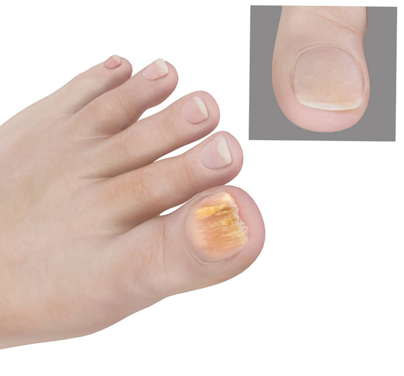 Российская классификация выделяет следующие виды онихомикоза – нормотрофический, гипертрофический и атрофический. В первом случае изменяется цвет больного ногтя, возникают отчетливые бело-желтые пятна и полосы, но при этом сохраняется естественная толщина пластины. На второй стадии заболевания ноготь деформируется и становится заметно толще, с края возможно частичное разрушение, пятна темнеют и даже зеленеют, кожа вокруг краснеет и воспаляется, при надавливании возникают болезненные ощущения. В тяжелых атрофических случаях пораженный ноготь отторгается.