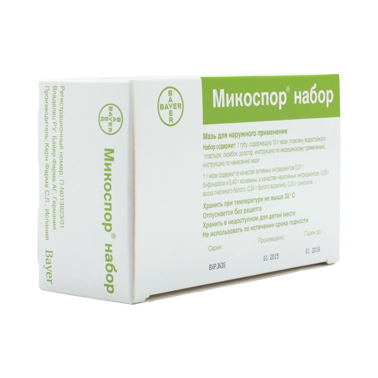 «Набор Микоспор». Кремом обрабатывают всю поверхность ногтя единожды в сутки. Наложить пластырь. Через 24 часа ноготь поместить в чистую теплую ванночку на 10 минут, снять размякшую пластину при помощи лопатки. Затем крем нанести повторно, закрыть пластырем.
