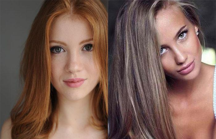 Зелено-голубые глаза характерны тем, что на радужной оболочке можно наблюдать сочетание сразу нескольких тонов (желтый, серый, коричневый). В зависимости от того, как меняется освещение, оттенок глаз может выглядеть по-разному. Для них идеальным вариантом будут такие оттенки прядей: русый, пшеничный, молочный и горький шоколад, каштан, черный. Не стоит пренебрегать красной и рыжей гаммой.