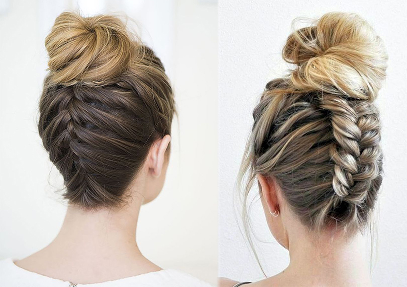 - Далее сформируйте из косички пучок, зафиксировав его шпильками или оставив в первозданном виде.