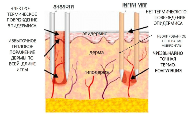 Данный способ, помогает приблизить радиоволну прямиком в дерму без отрицательного температурного влияния на эпидермис. Аппараты прошлого поколения имеют не изолированные иглы, и воздействие передается через всю иглу, что сильней травмирует, и не дает антивозрастного 3D эффекта после сеанса.