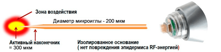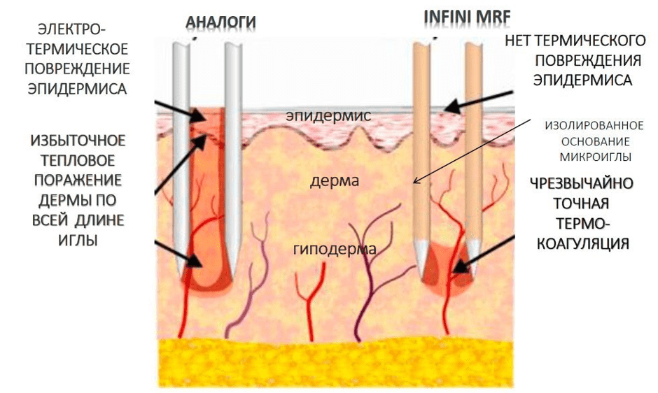 Данный способ, помогает приблизить радиоволну прямиком в дерму без отрицательного температурного влияния на эпидермис. Аппараты прошлого поколения имеют не изолированные иглы, и воздействие передается через всю иглу, что сильней травмирует, и не дает антивозрастного 3D эффекта после сеанса.