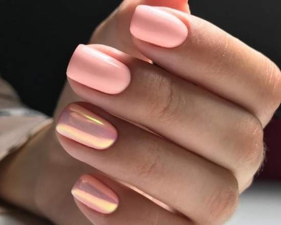 голографическая – выглядит очень эффектно и задорно, привлекает внимание сверкающими разноцветными переливами, лучше всего сочетается с яркими оттенками розового гель-лака, может стать удачным вариантом летнего маникюра;