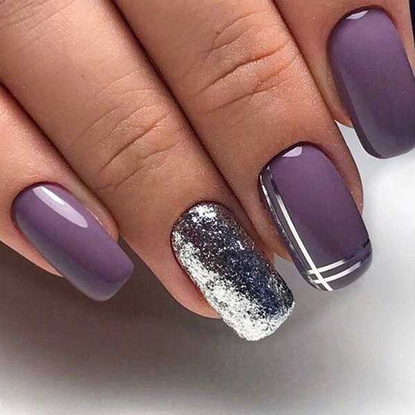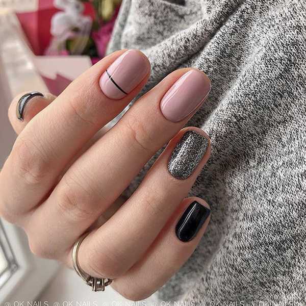 Полоса с блестками на однотонном ногте, рядом с ногтем покрытым блестящим гелем, придает этому маникюру завершенность.