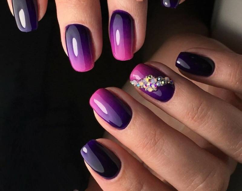 Интересный тренд маникюра омбре 2022 — использование термолаков. Даже небольшая смена температуры сделает маникюр немного другим — цвета поменяются. Отметим, что чем большее количество оттенков вы выбираете для растяжке на пластине, тем более четким и заметным будет переход.