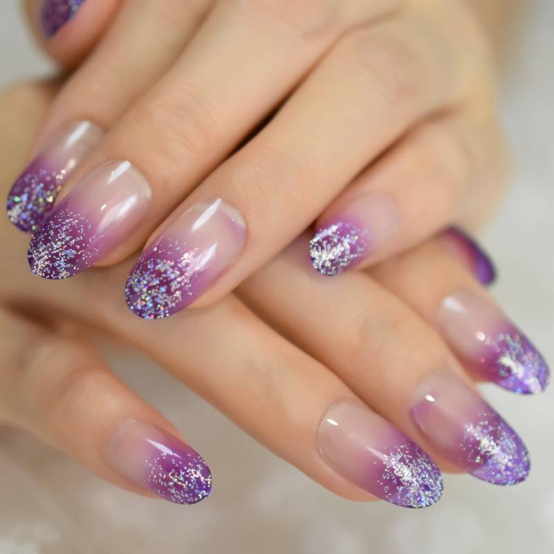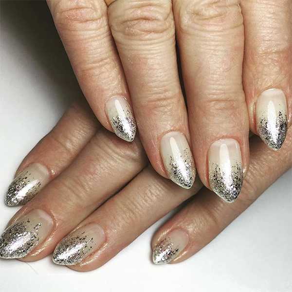 Существует два способа растяжки дизайна ногтей с блестками: либо акцент делается на кончике и растяжка плавно идет вверх по ногтю, либо она идет от основания ногтя к кончику. Первый вариант техники похож на французские ногти с блестками; он выглядит оригинально и свежо. Подходит для коротких и длинных ногтей квадратной формы и подчеркивает их красоту
