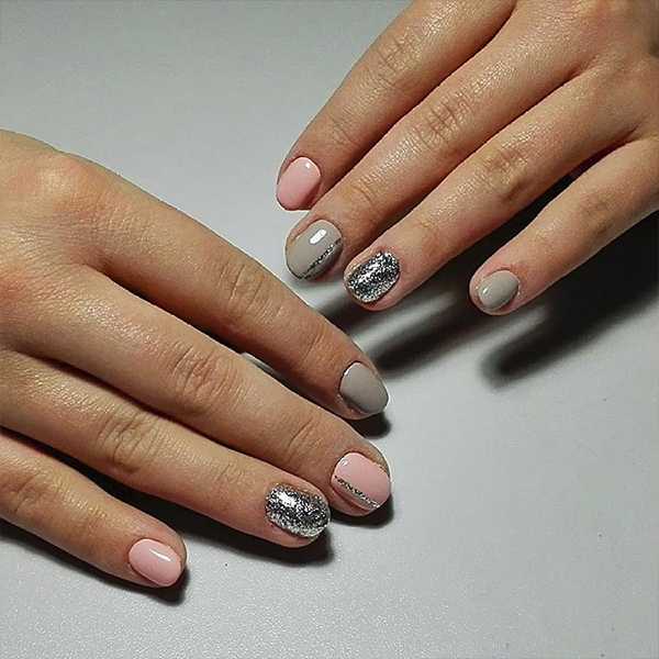Девушки и женщины уже успели по достоинству оценить оригинальность данного предложения, поэтому оформление маникюра с разными оттенками лака на руках становится всё более популярным. Такой подход в нейл-искусстве позволяет не только экспериментировать и создавать удивительный, не похожий на все остальные маникюр, но и считается очень удачным решением в ситуации, когда ну очень сложно определиться между несколькими приглянувшимися оттенками лака. Наносим на ногтевые пластины правой и левой руки разные по цвету покрытия, и украшаем блёстками на своё усмотрение. Это могут быть как полностью покрытые блестящими частицами ноготки, так и вариации маникюра с блестящими узорами либо сочетание декора с рисунками или стразами.