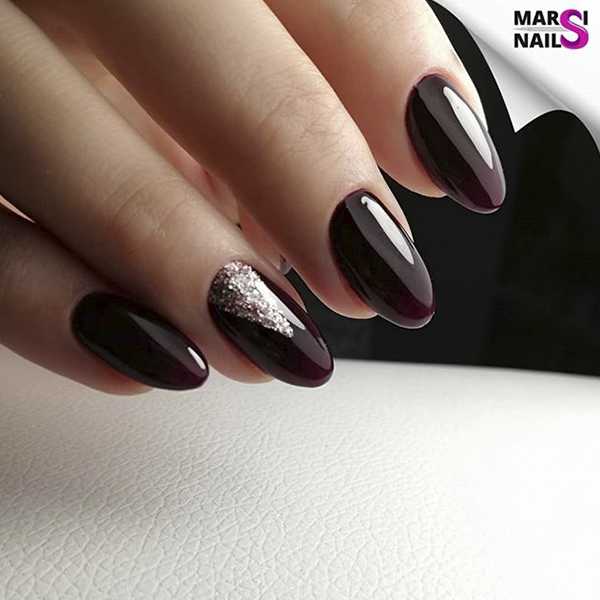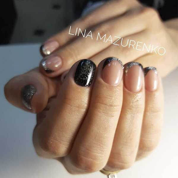 В черном цвете отлично смотрится геометрический декор. Глиттер используется для прорисовки отдельных зон на узоре, для сплошного покрытия ногтей. Присмотритесь к французскому маникюру с серебряным или золотым глиттером по краю ногтевой пластины. Визуально блестящая “улыбка” френча будет удлинять ноготки, делать маникюр эффектнее и благороднее.