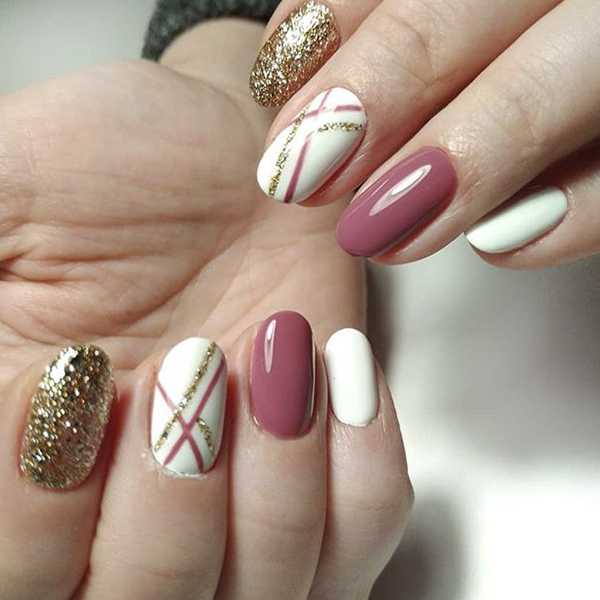 Но дополнительные цвета должны быть контрастными, чтобы в результате получить красивый геометрический рисунок. Золотыми блестками можно выделить контур рисунка, придав маникюру яркость и оригинальность.