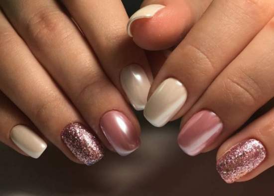 Также дизайн в нежных тонах можно сделать матовым, с бархатом, вязаная фактура, глянцевое покрытие, блестки или же сочетание различных вариантов. Очень хорошо будет сочетаться матовый с глянцем, бархат и матовый топ.