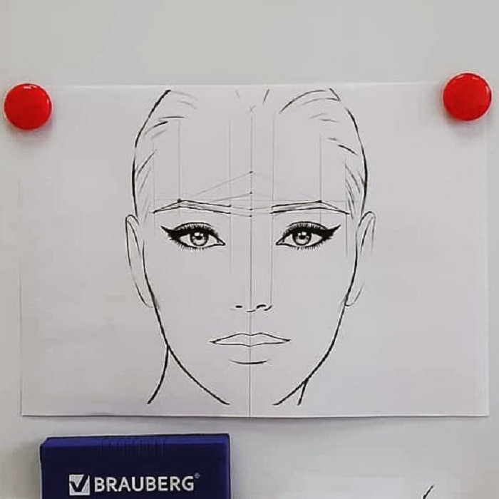 Правильный эскиз бровей должен быть составлен с учетом типа лица. Если форма овальная, можно применять различное построение, почти любую геометрию, но чаще всего создается классическая форма. Если лицо вытянутое, перед окрашиванием формируется прямая дуга, которая визуально расширяет овал.