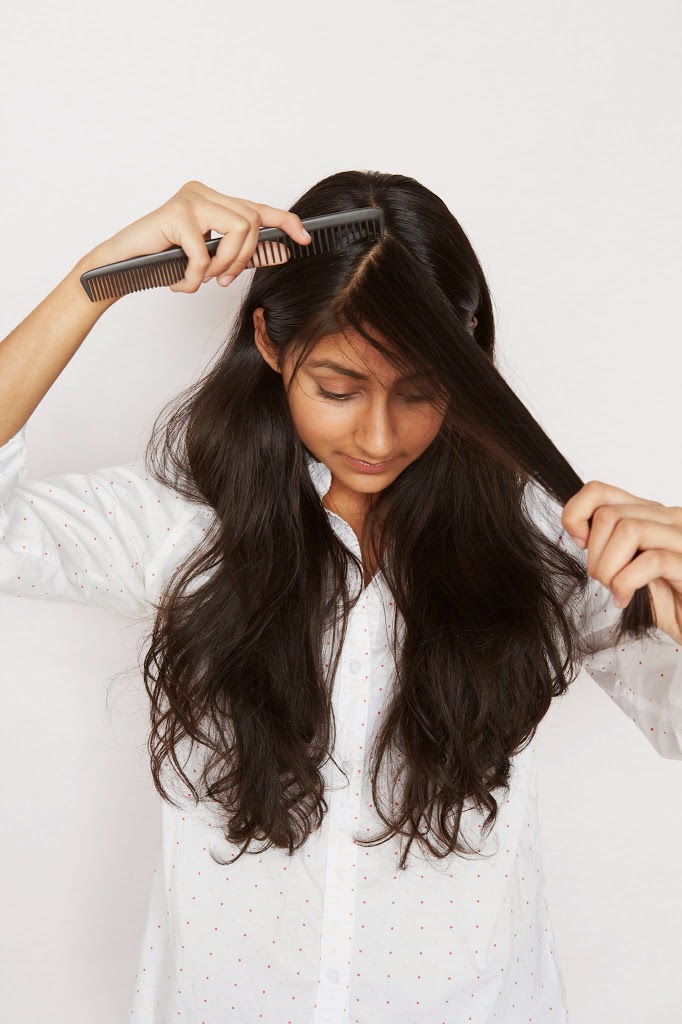 - Отделяем челку от остальных волос: разделим волосы пробором по центру, протянув его от макушки до лба.