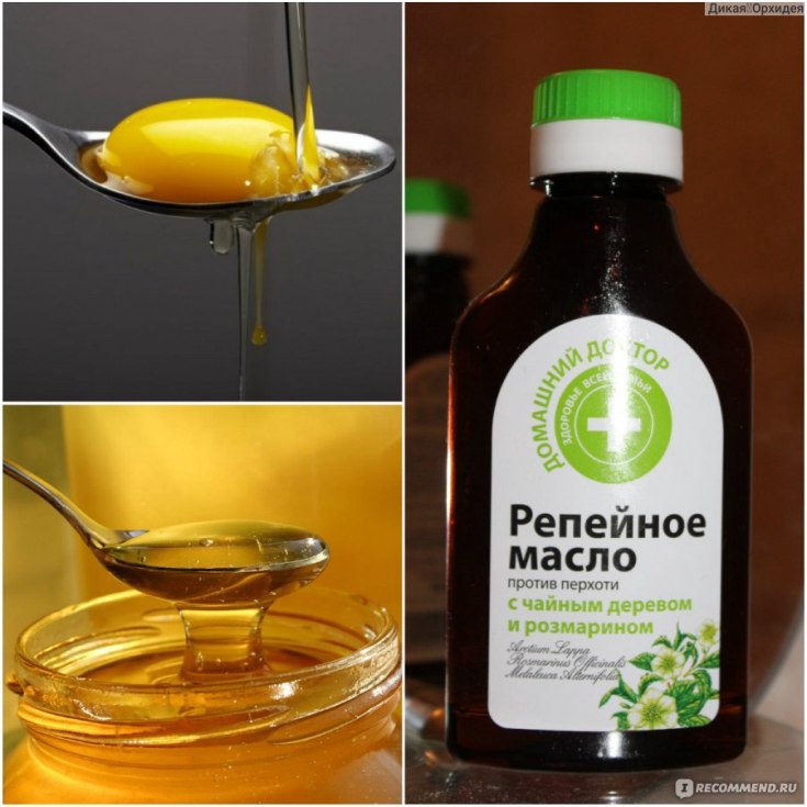 - Один из самых распространенных рецептов создается на основе меда, репейного масла и яйца. 100 грамм разогретого на водяной бане меда смешивают с 90 мл репейного масла и наносят на пряди. При добавлении в эту смесь куриного желтка смесь не подвергают нагреву. Выдержка такой смеси на голове составляет не более 3х часов.