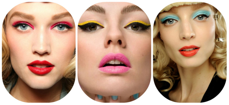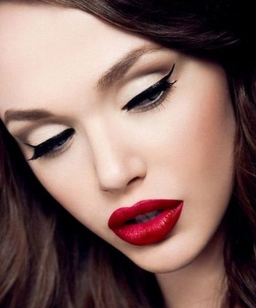 (опять-таки, яркой светло – красной помадой), при этом подкрашивая глаза нежным оттенком теней и корректируя скулы розовыми и светло – персиковыми румянами.