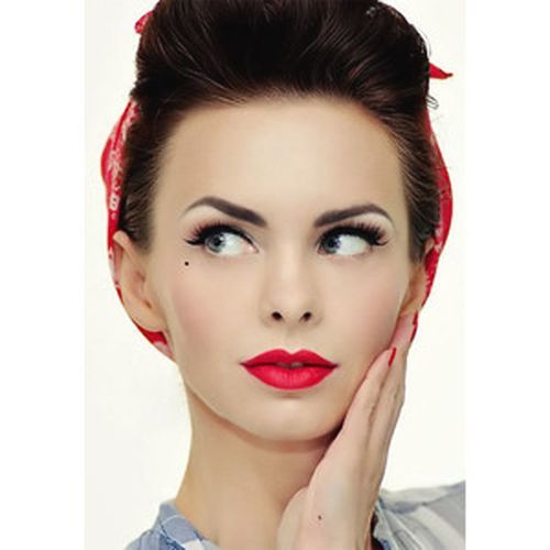 - После этого на губы нанесите помаду атласной плотной текстуры. Чтобы образ соответствовал романтике 50-х годов, можно использовать декоративную косметику для губ красных теплых тонов.