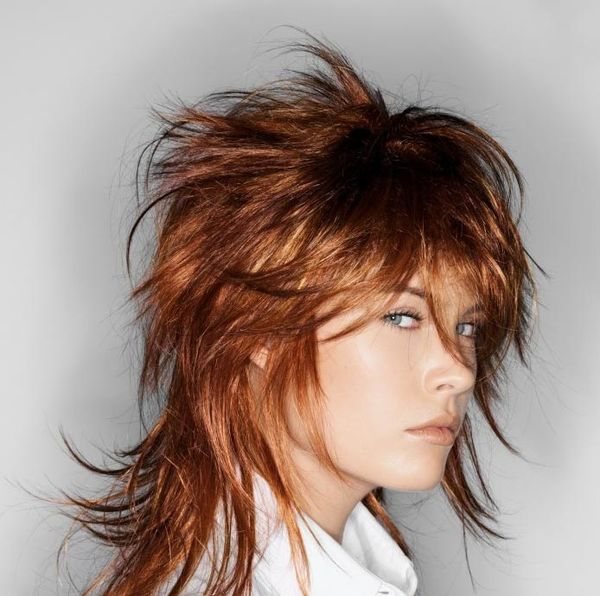 - с «рваной» челкой и неровными прядями волос, спускающимися по скулам к подбородку.