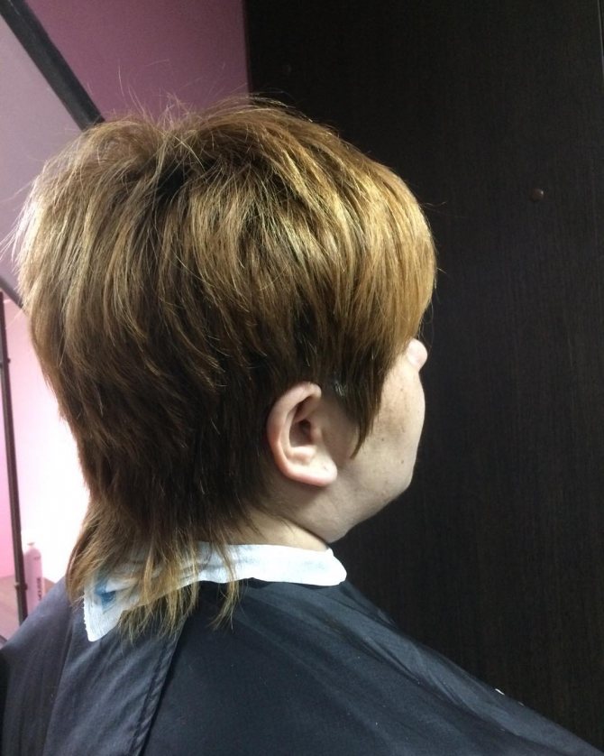 - с удлиненными волосами на затылке и височной части и асимметрично выстриженной челкой (примерно до середины глаз).