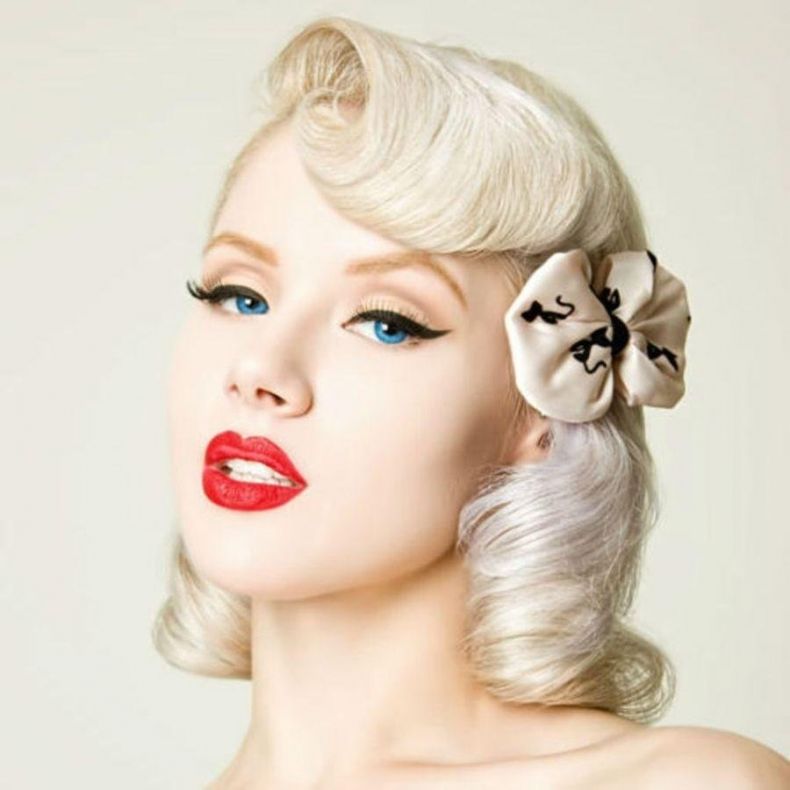 - В первую очередь нужно учитывать цвет волос. Если вы хотите носить прически постоянно, то вам нужно будет перекраситься в яркого блондина или же в четкого брюнета. Никакие другие оттенки волос не подходят. Конечно их делают девушки и с рыжим цветом, и разными другими, но все же эти оттенки не столь характерны для причесок ретро. Поэтому даже если вы решили перекраситься, то все же учтите, подойдет ли вам выбранный оттенок.