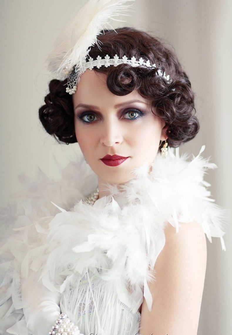 Популярные прически «гангстерских» тридцатых годов – «застывшая волна» и пластичные локоны – отличаются чуть большей длиной волос и все такой же безукоризненностью укладки. Для создания прически для маленьких девочек на короткие волосы в стиле 30-х необходимо накрутить мягкие локоны, обработать их лаком и надеть стильную повязку, украшенную камнями и перьями.