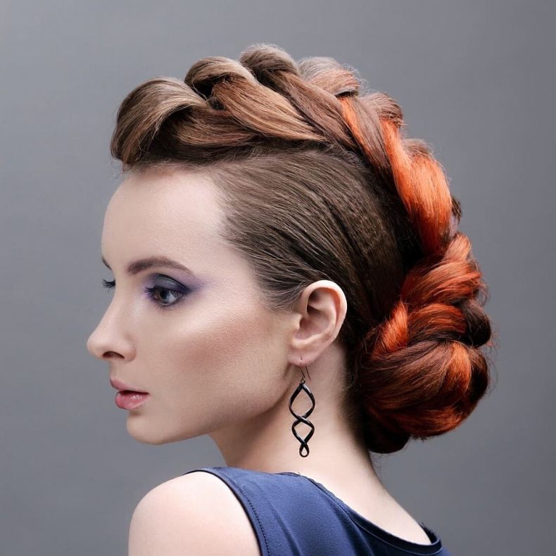- с выстриженными висками (в т. ч. с мелированием и асимметричным окрашиванием прядей в яркие тона);