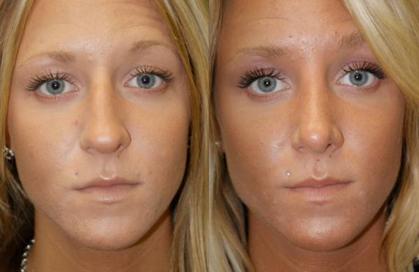 Обратите внимание на фото — коррекция не заметна, но при этом губы стали выразительнее, чувственней и позитивнее, а носик визуально короче и аккуратнее смотрится на лице — более прямой и вздернутый